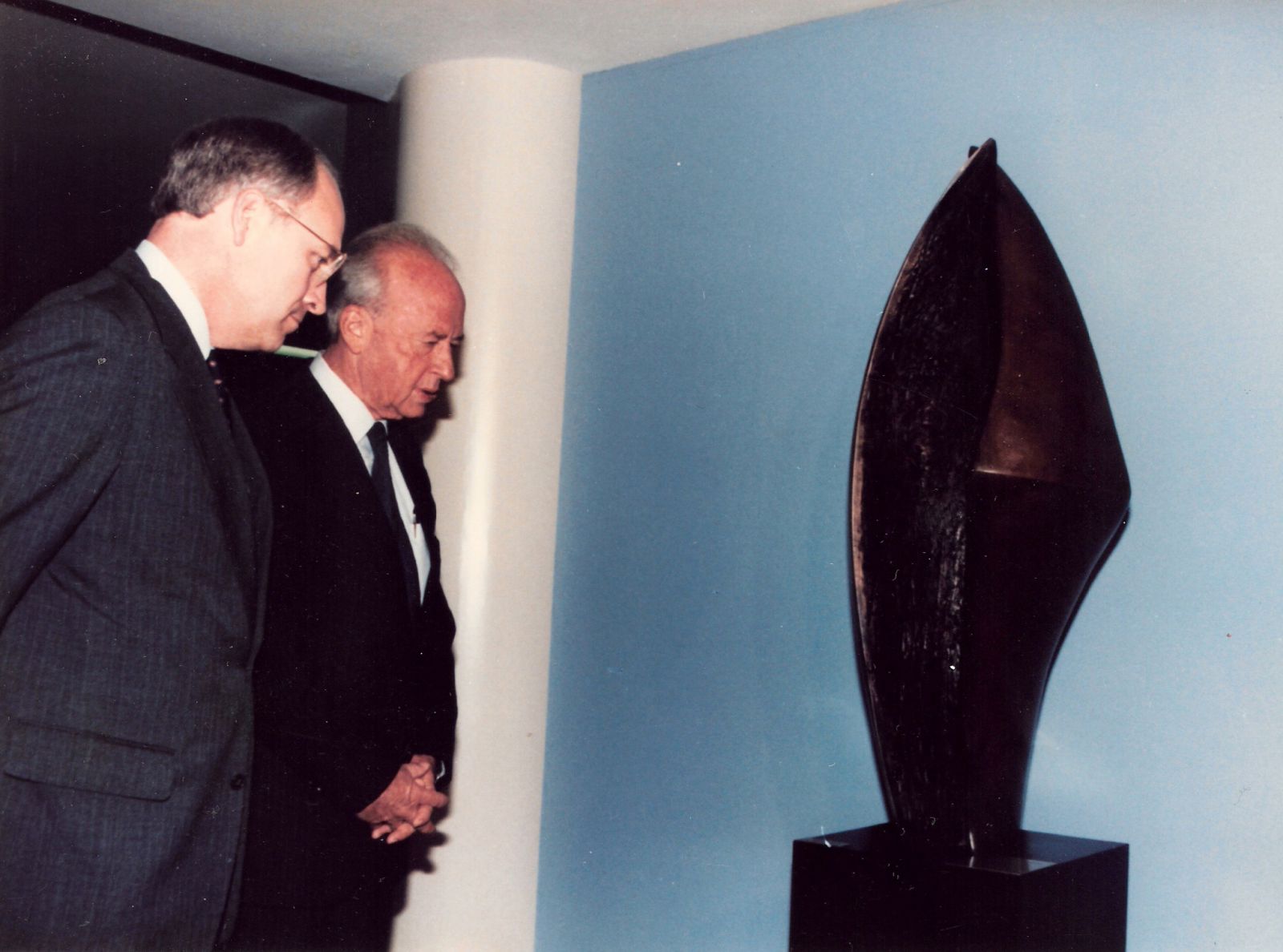 מר יצחק רבין שר הביטחון ושר ההגנה היוצא של ארהב בטקס קבלת פיסלי "תפילה לשלום" במוזיאון תל אביב לפני העברתו לפנטגון בארה"ב.