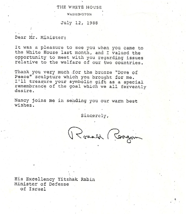 מכתה התודה של נשיא ארצות הברית מר רונלד ריגן עם קבלת פסלי "יונת השלום"